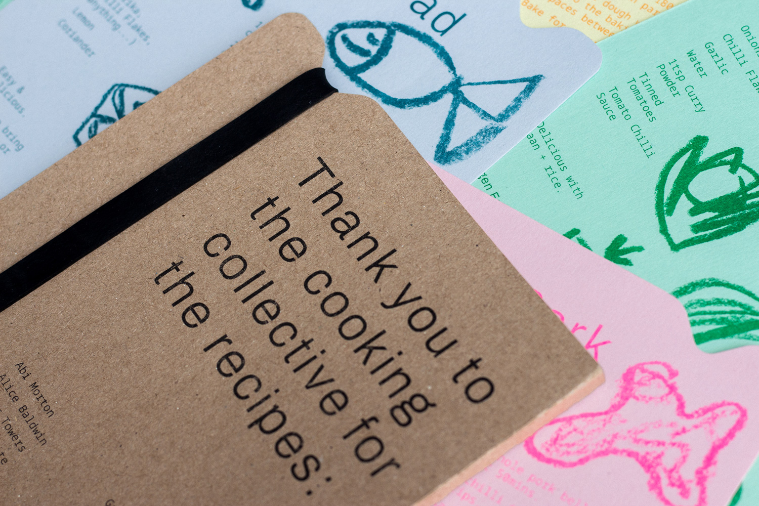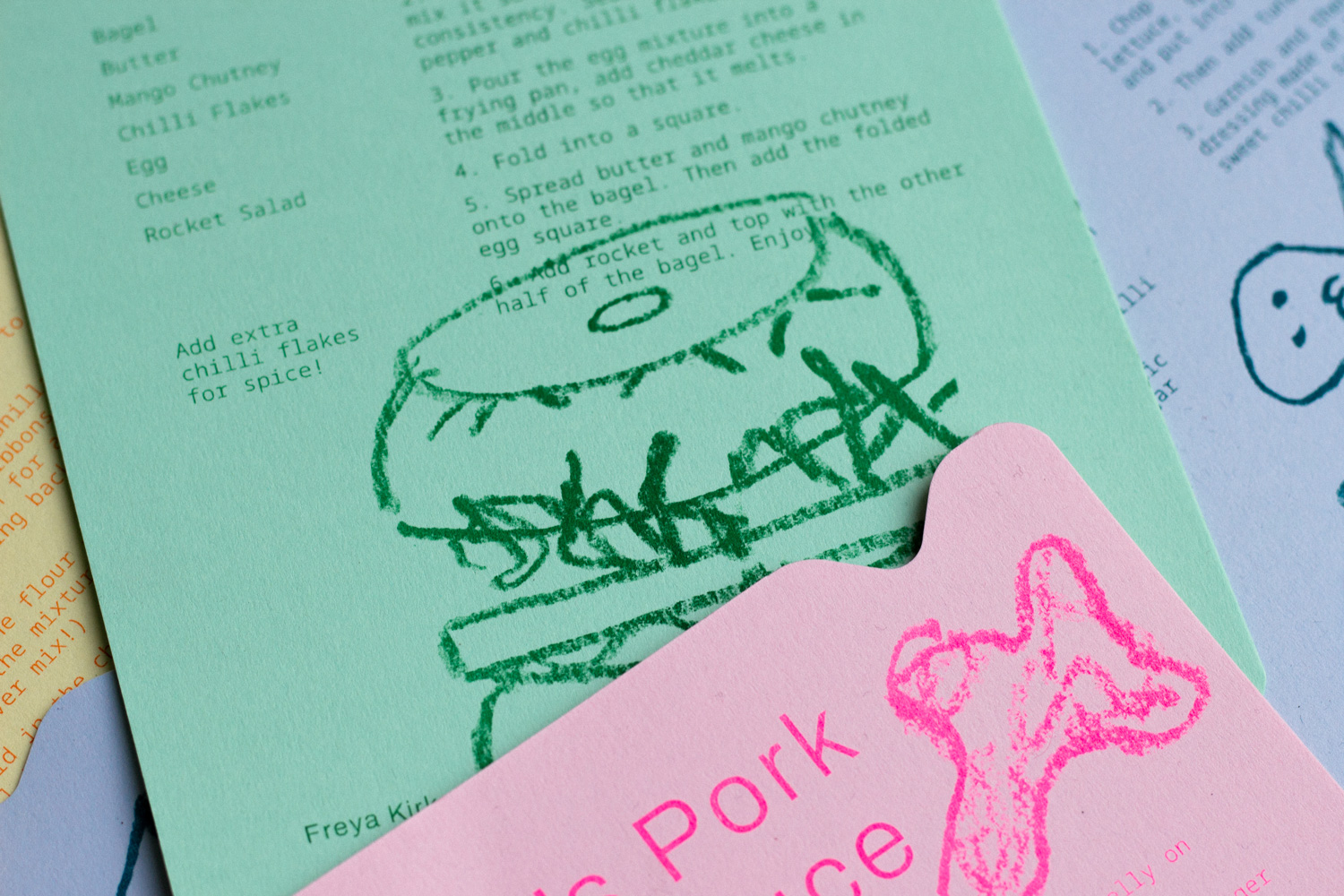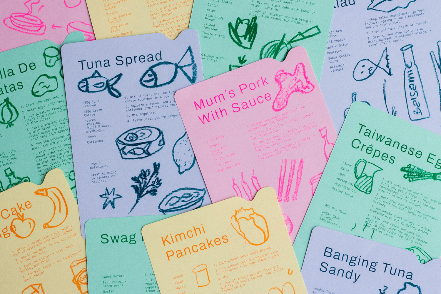 A collaborative community-sourced cookbook of student recipes, collected from members of the graphic design community as a way of sharing and connecting through food. The recipes and hand-drawn illustrations were collected from participants and combined into a visual identity system to create colour-coded recipe cards; designed to be shuffled and shared with others.